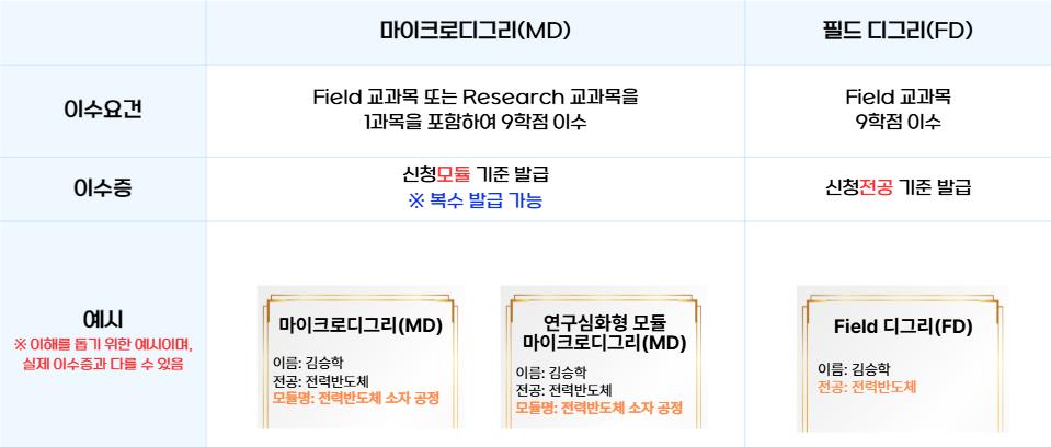 - FD는 신청 연합전공 내 Field 교과목 만으로 9학점 이수 시 이수증 발급